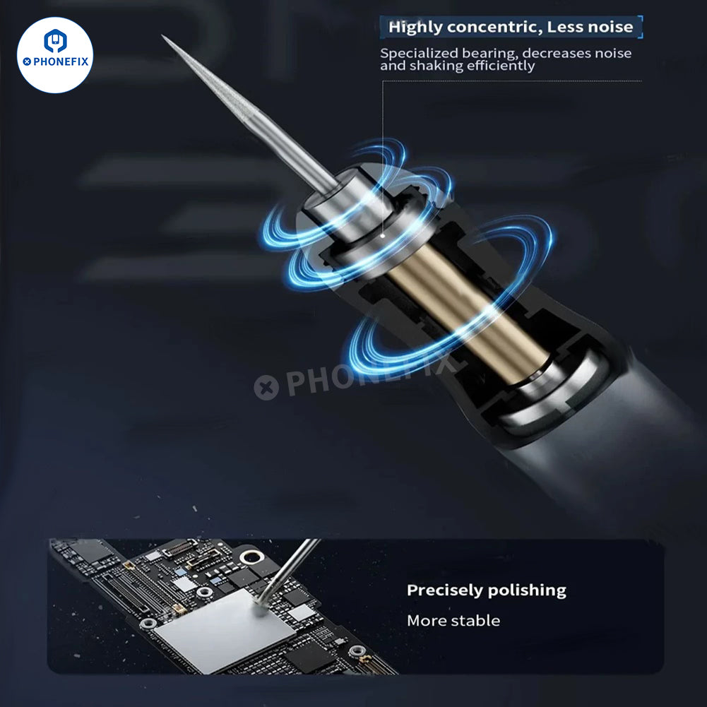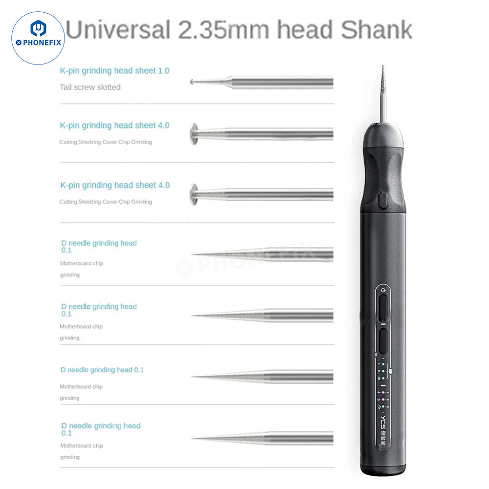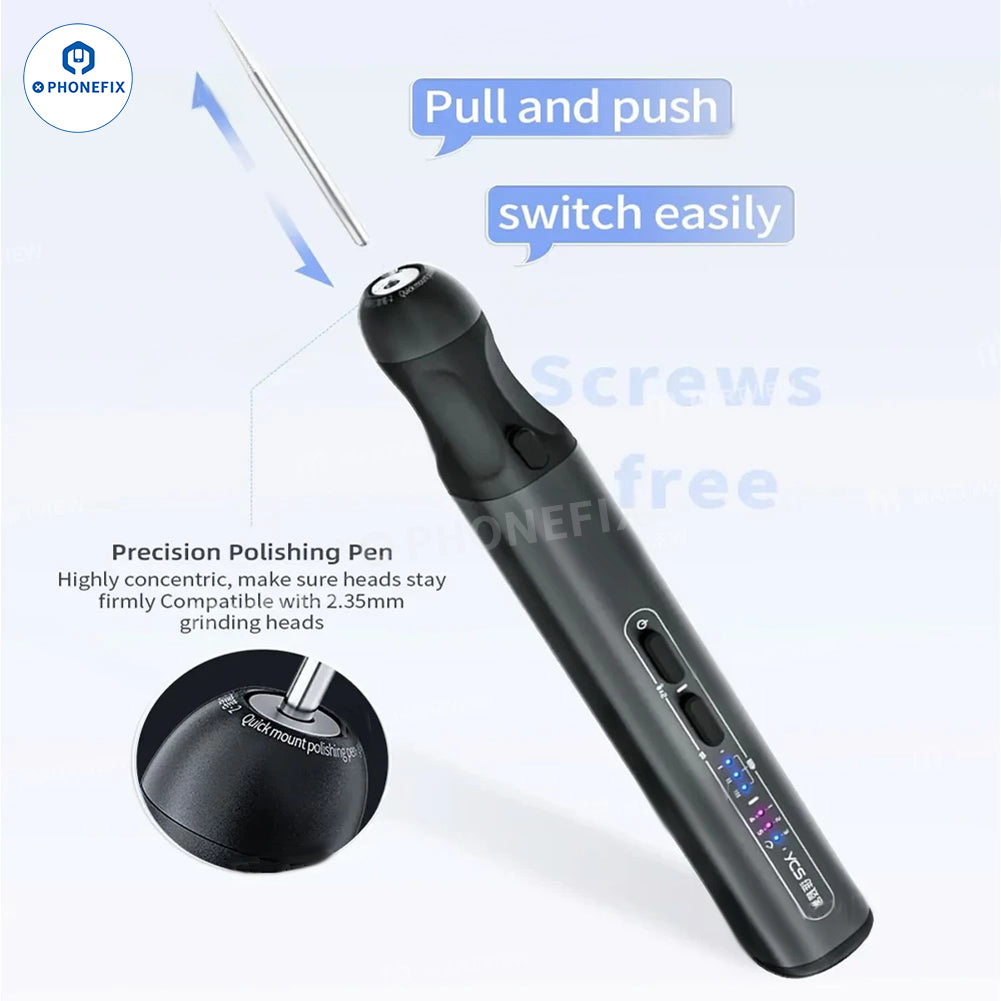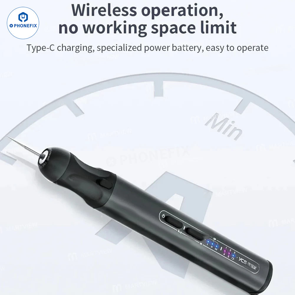 YCS 2nd Gen Electric Polishing Grinding Pen for electronic/mobile phone motherboard CPU chip screen IC drilling and disassembly and glue removal. YCS TYPE-C rechargeable grinding pen built-in battery, five gears to choose from, lights to indicate different states, easy to use.