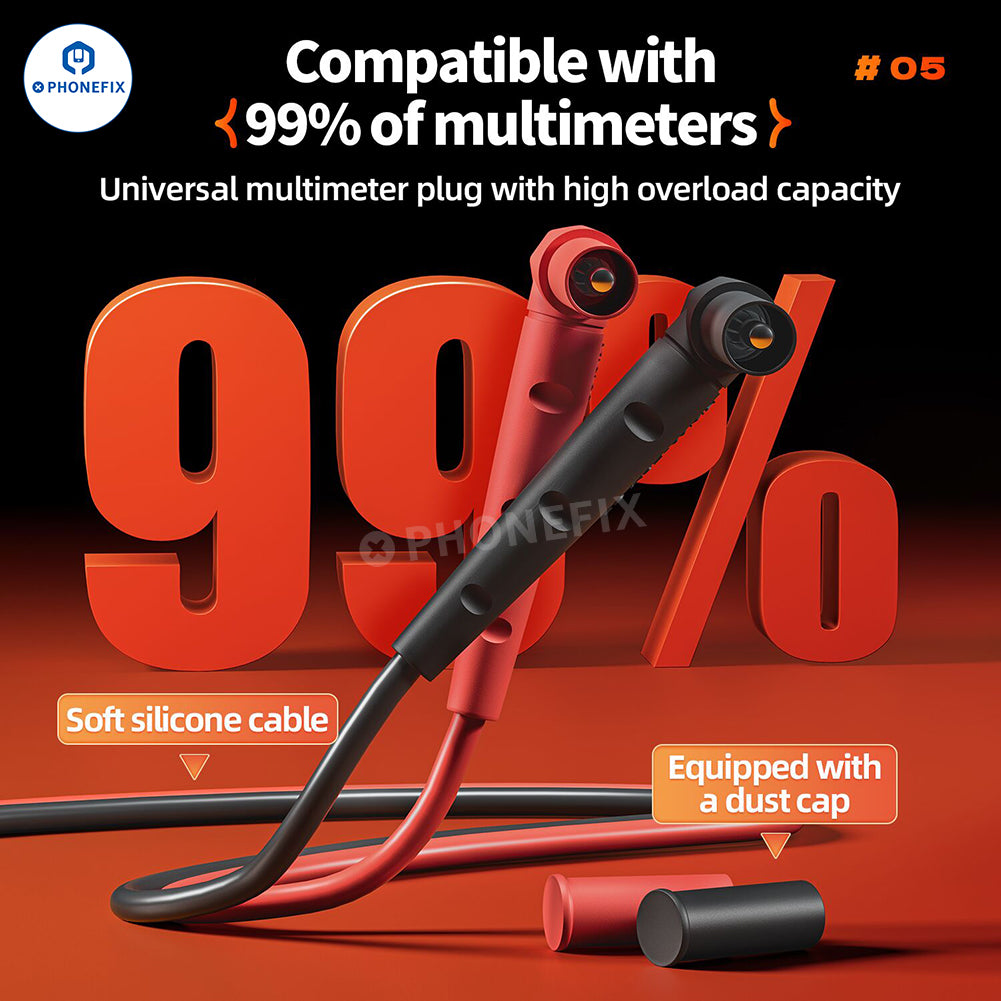 YCS 1000V 20A Extra-tip multimeter pen with 0.28mm ultra-fine probes are compatible with 99% of multimeters on the market and are suitable for mobile phone repair, motherboard circuit measurement, and BGA IC measurement of various electronic product circuit boards. YCS multimeter leads use flexible and durable silicone cables and high-quality probe tips, featuring ultra-low resistance and high overload capacity, enabling accurate measurement and improving mobile phone repair efficiency.
