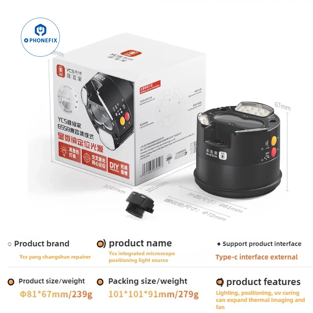 YCS 6558 Integrated Microscope 3D Positioning Light Source with UV curing lamp, expandable thermal imaging and cooling fan for mobile phone motherboard repair. YCS Microscope Tool With high CRI LED lighting, UV curing and thermal imaging compatibility, compatible with most microscopes, suitable for mobile phone repair, laptop repair, electronic PCB soldering, BGA chip micro soldering, etc.