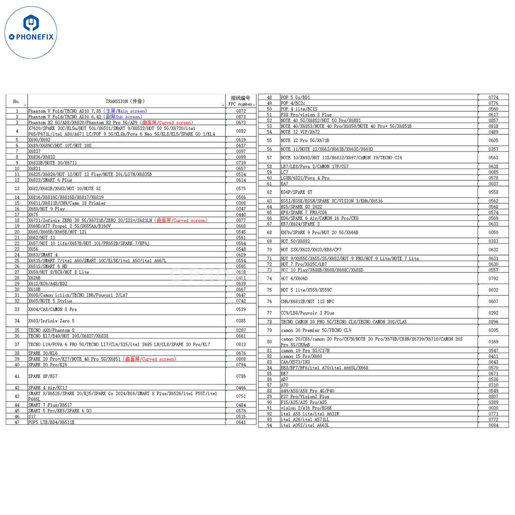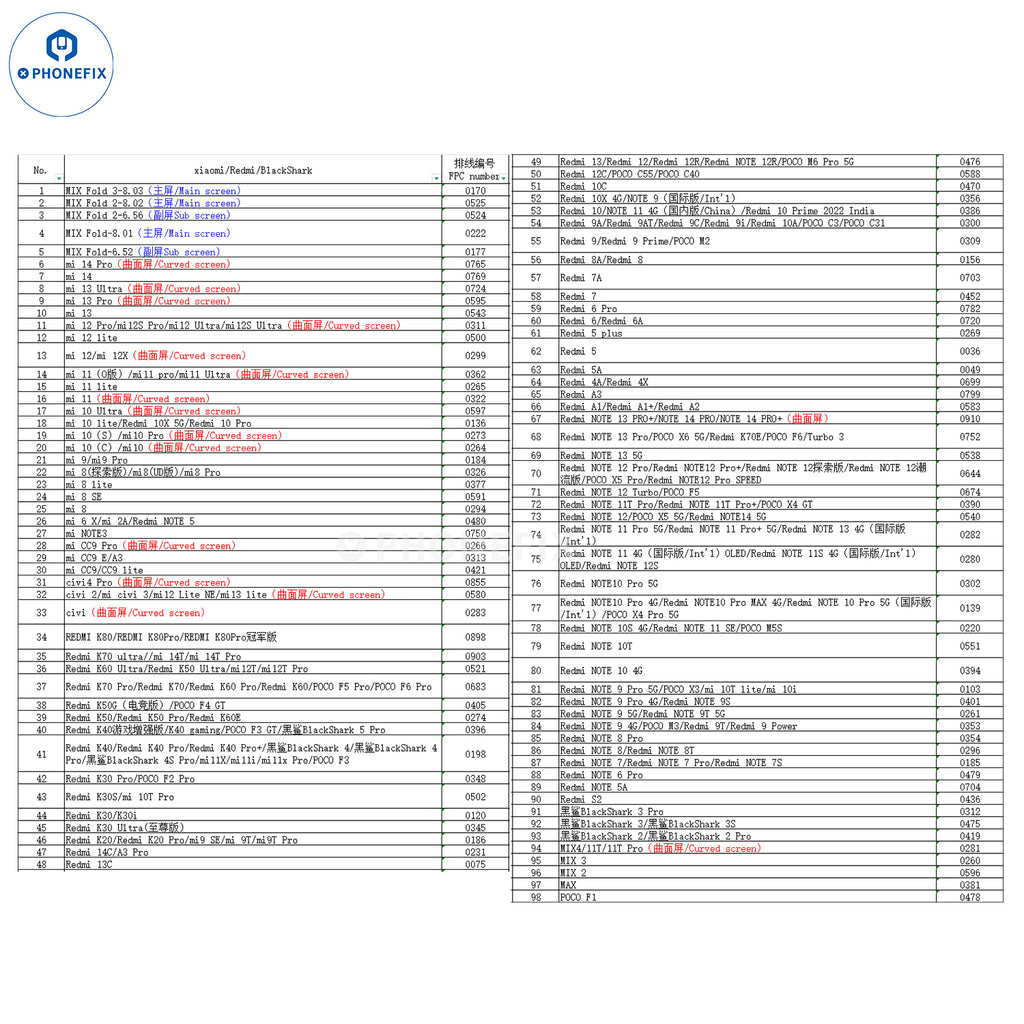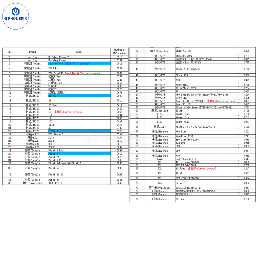 Option: 1. YCX M830 screen tester (No battery). 2. YCX M8 screen tester (No battery). 3. YCX M8/M830+ 25pcs test cable for iPhone 6-16 Plus (No include 13 Pro-16 Pro Series). 4. Phone screen test cables (Pls choose the models). Please note: There are too many Android phone models, please check the pictures, select the correct model, and leave a message stating the model you need, or send an email to myvipprogrammer@gmail.com. Software: https://drive.google.com/file/d/1rLdvMh6nWINgGAJQ4fq0aONoxuVCaIz3/view?usp=sharing