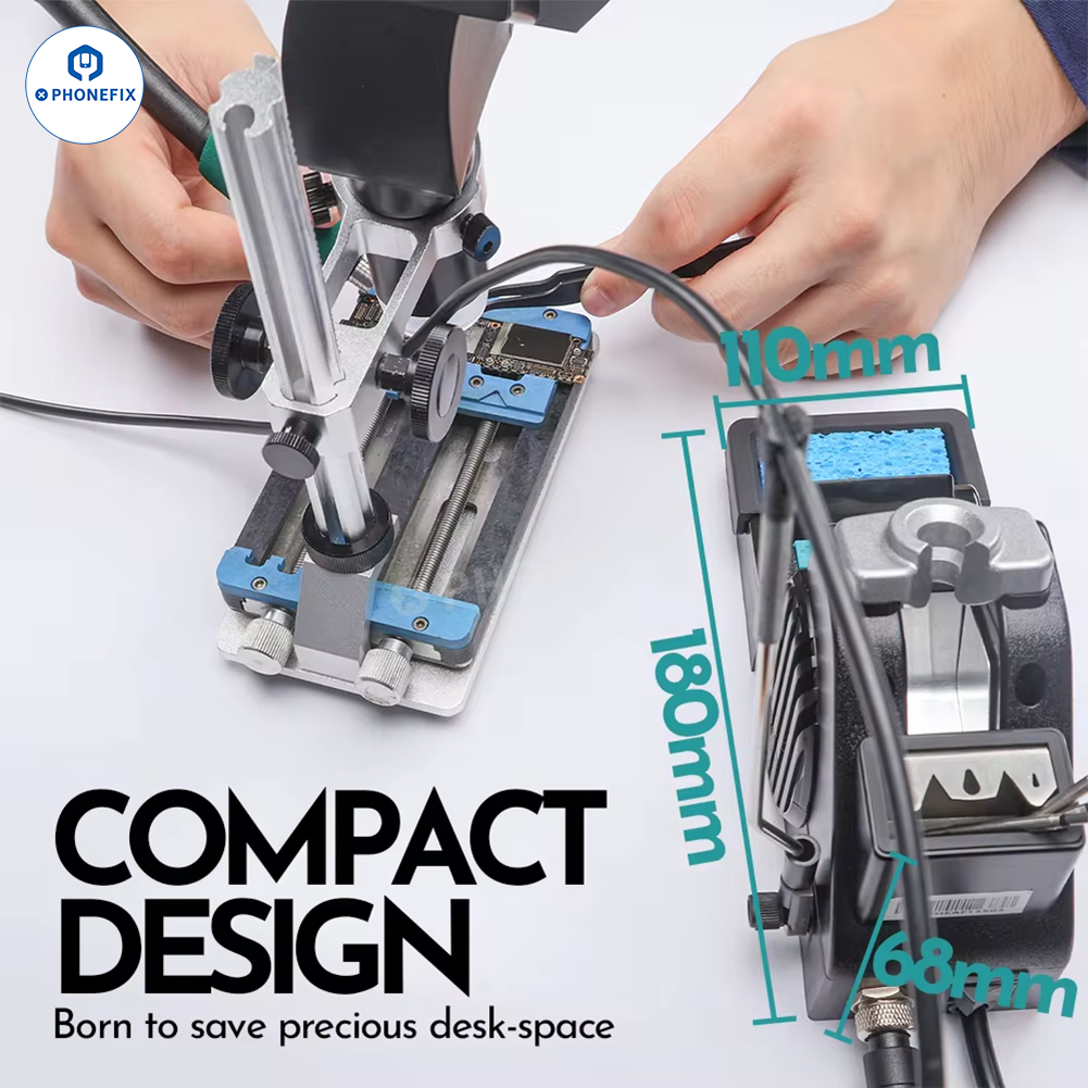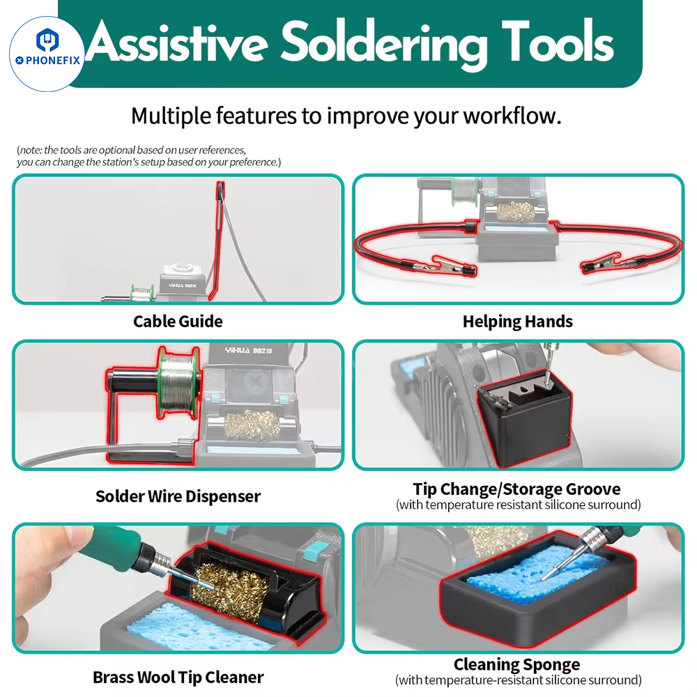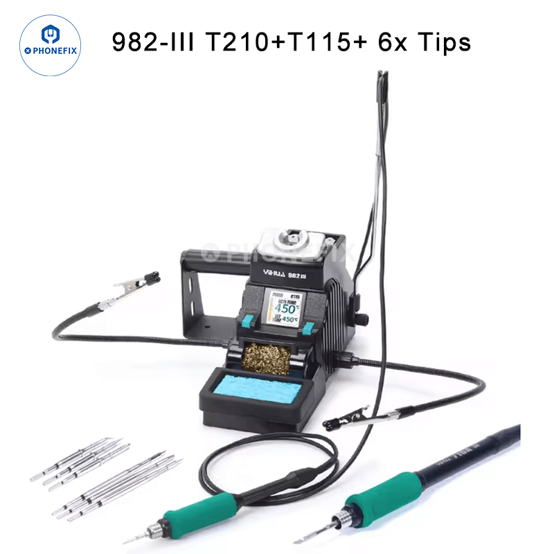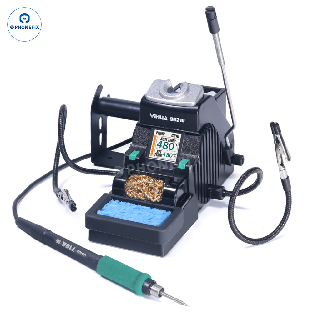 YIHUA 982-III portable precision soldering station with 2 help hands clamp, compatible with T115 T210 handle C210 C115 soldering iron tips for Phone PCB circuit board BGA chip micro-soldering and precision soldering.