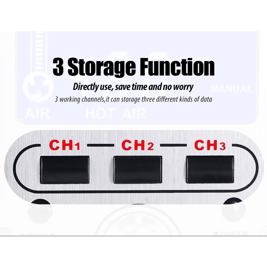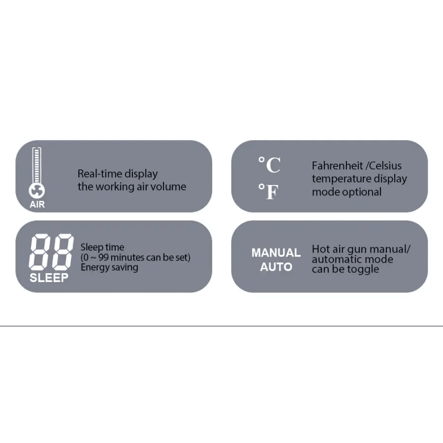 1. Suitable for a various kind of soldering or de-soldering (removals)purposes of the electronic components such as: SOIC, CHIP, QFP, PLCC, BGA, SMD, etc.